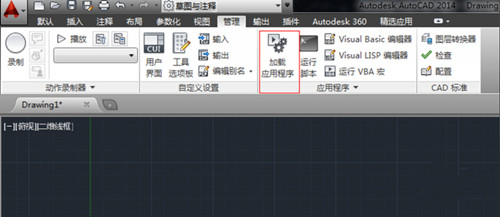 2、打开自身安装的AutoCAD 2000以上的版本,在CAD的面板标题上找到“管理”-“应用 程序”-“加载应用程序”。点击进去加载界面
