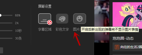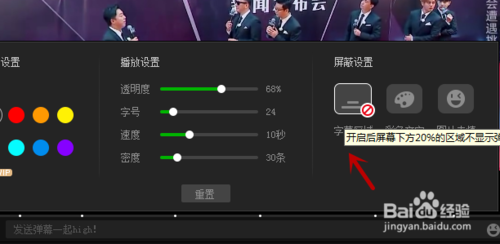 4、发送设置主要是发送字体的颜色的设置,播放设置则包括播放文字的透明度、字号、速度、密度,屏蔽设置的字幕区域是指开启后屏幕下方20%的区域不显示弹幕,彩色文字是指开启后新出现的弹幕均为白色,图片表情是指开启后新出现的弹幕将不显示图片表情。