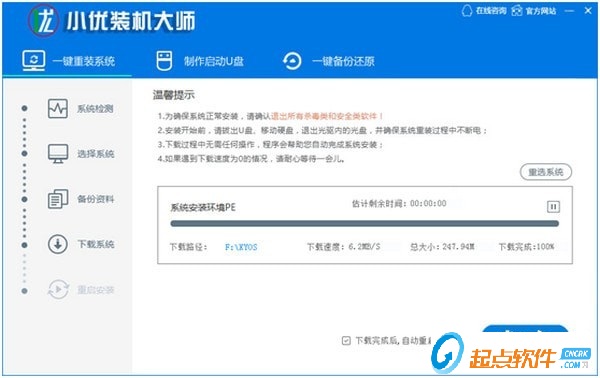 到了这一步时用户即可离开电脑,程序会全自动完成重装步骤。为防止出现安装失败,用户也可以选择“制作启动U盘”进行U盘装机。