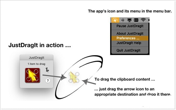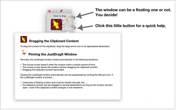 每当JustDragIt Mac版的剪贴板接收到新内容时,鼠标光标附近就会出现一个小窗口(这是可以在应用程序的首选项中更改的默认行为)。这个小窗口——所谓的“拖动操作窗口”——包含一个可拖动的图标。要拖动当前剪贴板内容,只需将此图标拖到适当的目的地并将其放在那里—就这样。JustDragIt Mac版也可以“钉住”“拖动操作窗口”,使其成为一个浮动窗口。在此模式下,您可以将当前剪贴板内容拖动到多个目的地——即使剪贴板内容在此期间发生了更改。
