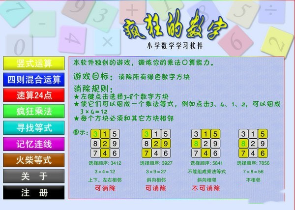 1、疯狂乘法:本软件独创数学游戏,锻炼你的乘法口算能力。游戏目标:消除所有绿色数字方块。消除规则:选择3-8个数字方块,如果它们满足两个条件,这些方块就会被消除。1、它们可以组成一个乘法等式;2、每个方块必须和其它方块相邻。通过这个游戏,你的乘法口诀一定会滚瓜烂熟的。