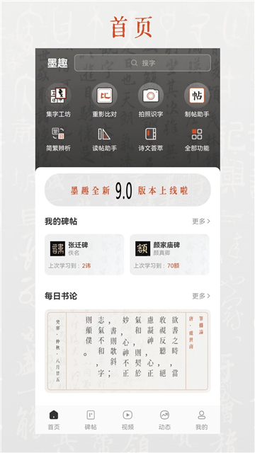 8、此外还有书法教学视频、书坛资讯、书友社区、制帖助手、诗文荟萃、简繁辨析等丰富的书法学习资源与实用功能,能帮助您更高效地开展书法学习。