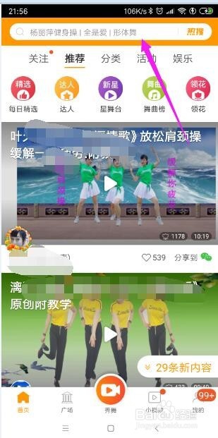 在糖豆的主界面,点击上方的搜索位置,可以输入自己喜欢的广场舞关键字。