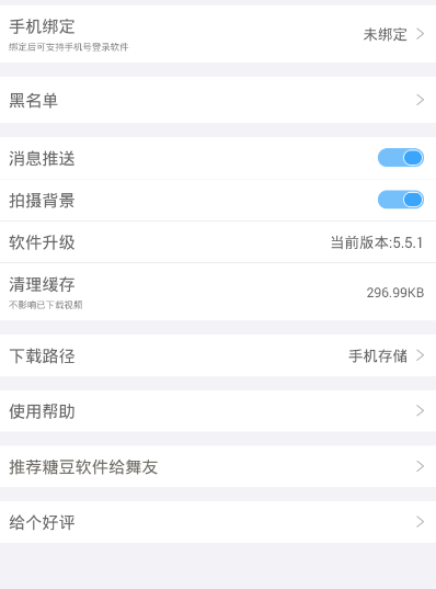 5、软件设置包括了手机绑定、黑名单、消息推送、拍摄背景、软件升级、清理缓存、下载路径等;
