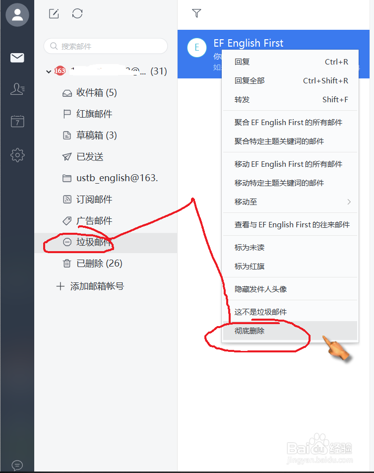 点击“垃圾邮件”,右键点击单个垃圾邮件,选择彻底删除即可将垃圾邮件彻底删除。
