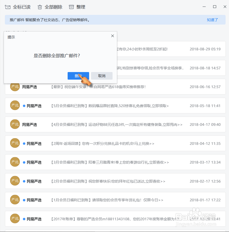 点击右上角“全部删除”,点击确定,即可删除全部推广邮件。