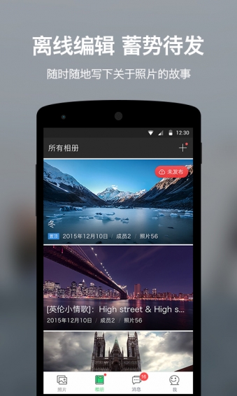 【共建相册,快速分享照片】一人上传,其他成员立即看到,并可以评论点赞。从此再也不必为收集一次活动中的散乱照片而四处索要。你要做的仅是在相册圈中新建一个相册。