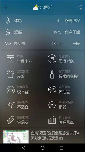 3、操作方便:上下滑动的操作方式,可更快速更便捷的查看天气趋势、风速、生活指数等信息。