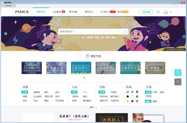 【海量模板,实时更新】MAKA平台有30000+专业设计师提供原创精致的主题模板,10000+优质素材每天实时更新,根据场景需要选择相应的模板进行编辑,包括人才招聘、会议邀请函、婚礼请柬、节日祝福、品牌宣传、纪念相册、告白求婚等