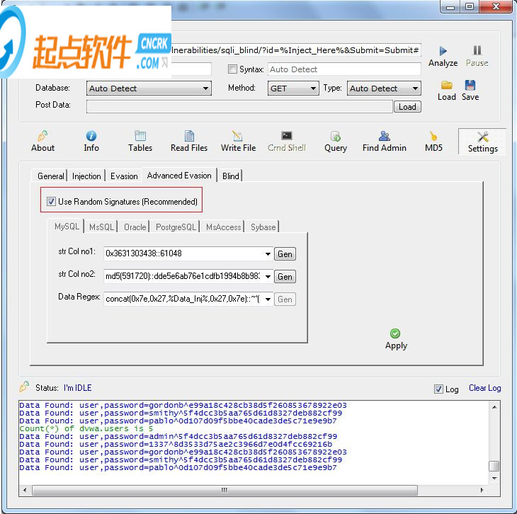 havij怎么使用?为了获得更可靠的结果,默认情况下havij采用随机签名的每一次。如果你需要改变默认的行为,你改变设置中的高级闪避标签从。禁用使用随机签名,并输入您的自定义签名为不同的数据库服务器,或点击在每个签名字段前面的按钮,以使用所提供的随机签名发生器。