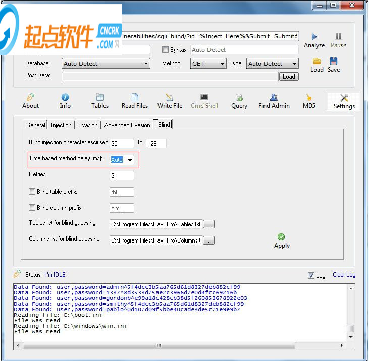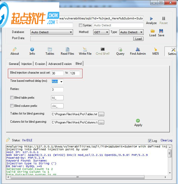 盲目注射havij发现每个字符的二进制数据的试验和错误的方法被称为区间二分法。这havij用途可改变字符范围。您可以在“设置”视图中使用“盲注入字符ASCII集”选项更改当前字符范围。