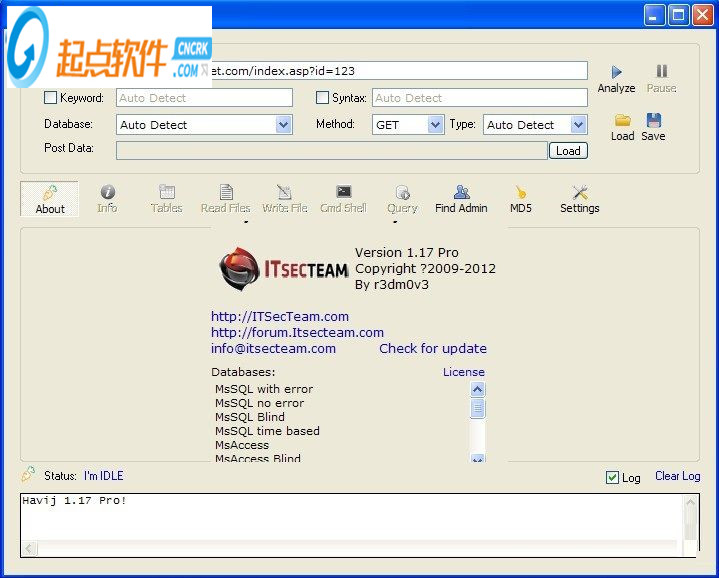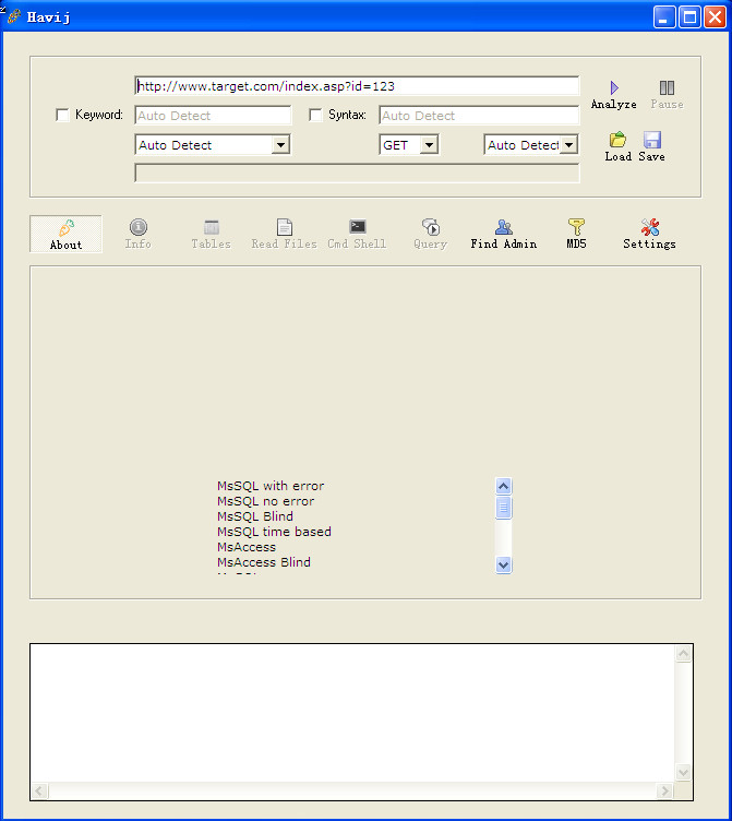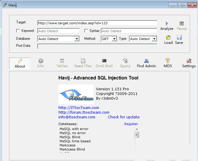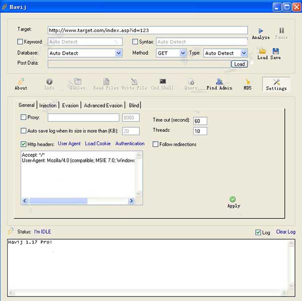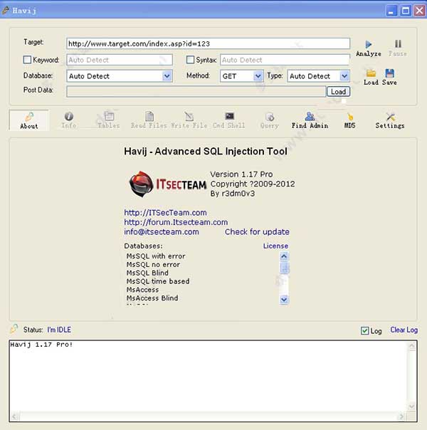 Havij(SQL注入软件)是一款十分优秀的SQL自动化注入工具。想找个sql注入工具?Havij(SQL注入软件)是你最佳选择。软件不仅能够自动挖掘可利用的SQL 查询,还能够识别后台数据库类型、检索数据的用户名和密码hash、转储表和列、从数据库中提取数据,甚至访问底层文件系统和执行系统命令。软件支持广泛的数据库系统,支持参数配置以躲避IDS,支持代理,后台登陆地址扫描。