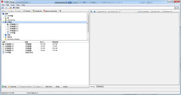 WildBit Viewer之所以能够在浏览海量图片时带有非常高的效率,主要借助于它的界面设计及功能:WildBit Viewer带有非常实用的左侧栏,左侧栏上半部分是树状目录,通过鼠标点击就可以对图片文件夹进行定位,跳转到其他文件夹也是非常快速。左侧栏下部则是你访问的文件夹中的图片文件列表,使用一下滚轮,点击一下鼠标就可以查看指定的图片。