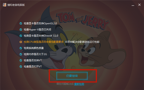 1、首先从起点软件园下载“猫和老鼠手游模拟器”,然后双击应用程序。2、等待检查完成,点击“仍要继续”选项。
