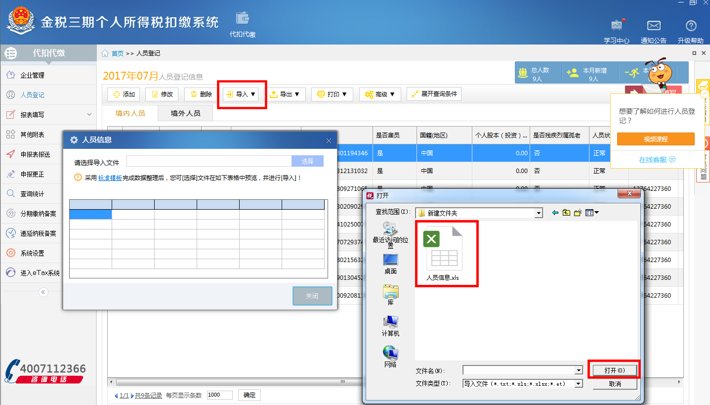 3、在【人员登记】中点击【导入】按钮,选择已修改保存的EXCEL人员信息表,完成导入。人员信息数据将根据表单批量更新修改。