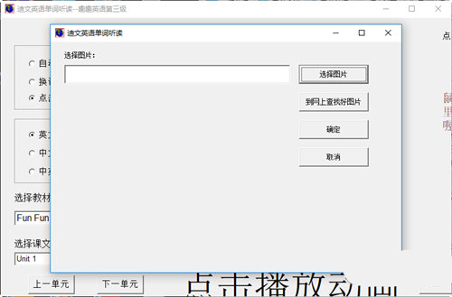 1、听读模式:迪文英语单词听读有三种模式,自动播放、换词时朗读和点击图片时播放。自动播放模式下单词会自动循环播放,用于大声跟读。换词时朗读是在点击下一个单词按钮是会朗读单词,用于慢速地跟读。点击图片时播放是当点击下一个或上一个单词时不会朗读,这是您可以让您的孩子大声的读,然后用鼠标点击图片或者单词时就会播放,该模式用于测试您的孩子的发音是否准确。2、选择课文:您可以通过选择教材和课文的两个下拉框选择您的孩子要学习的课文,下面的两个按钮可以帮助您跳到前一课或后一课。