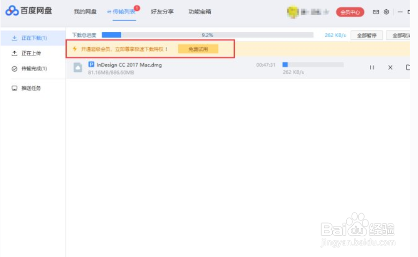 然后点击百度网盘“免费试用”或“体验提速”,试用、体验一般为5分钟左右。