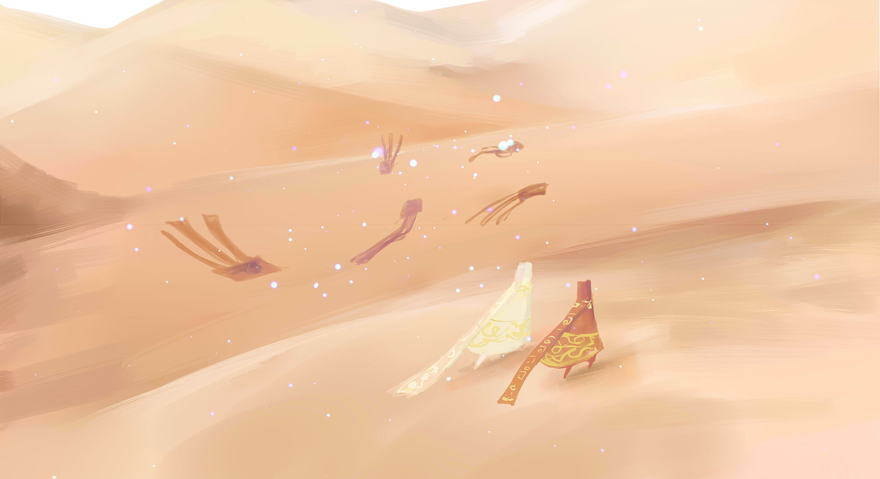 主角设定1、一位无名旅者自沙漠中苏醒,它拥有腾空飞行的能力,唯一的目标便是远方的山。在那座山上有一道光,直通天际。旅者认为那里是圣人的所在地,为了朝圣他踏上了未知的旅途。在游戏中玩家的最终目标就是控制角色到达旅程的终点——远方的山,到达终点后角色会走进一道耀眼的白色光芒中死亡然后再次复活回到起点,角色会在无限的复活中解锁不同的外观。