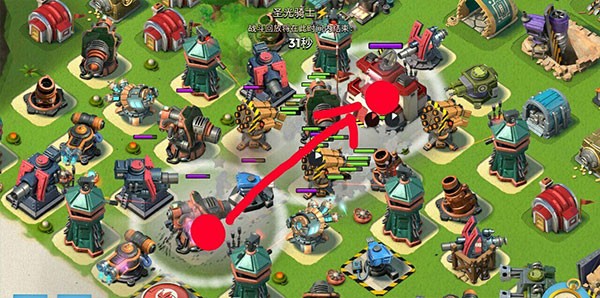 2先把部队引到石材库的正上方,接着再引导一波去激光那里,等烟雾消失后立刻开启群体嘲讽技能,这样就能快速把激光装置拆掉;之后让妹妹把目标转向下方的火箭,要记得这个火箭得先用火炮提前打残血,再迅速把它拆除掉。