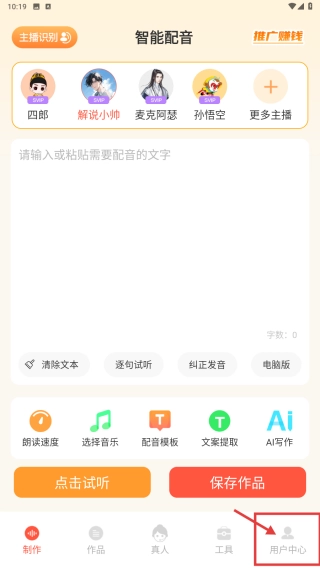 1、打开配音类应用,点击底部的“用户中心”选项,进入个人中心页面。
