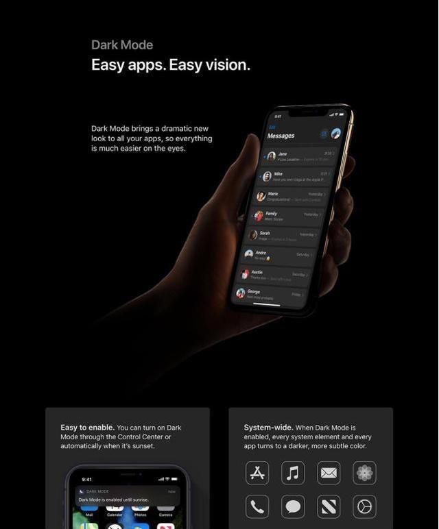 iOS13中支持全新的黑色模式,整体系统配色将会匹配全新的黑色模式。同时,音乐也会支持黑色模式。iOS 13的黑暗模式,很美观,苹果自家的应用包括《日历》、《备忘录》、《信息》、《照片》等都有着很好的兼容,纯黑的背景搭配白色的文字,图片元素的色彩没有失真,在照片分享时UI的界面细节也做得很好,键盘也有黑暗背景,可以看出iOS 13的黑暗模式质感细腻,细节完善。