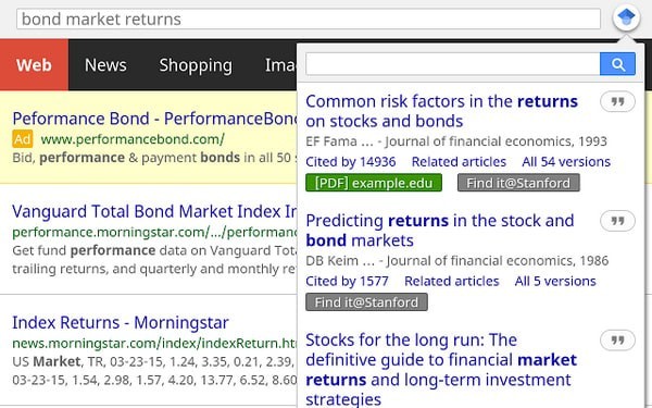 Google学术搜索按钮是一款由谷歌公司提供的一款google官方浏览器插件,可以帮助学生和工作者更加快速地从chrome中,获取学术论文的按钮,用户在安装了Google学术搜索按钮插件后,在chrome中的任意一个网页,复制一篇学术论文的标题,即可以快速地启动谷歌学术搜索的功能。用户在使用普通的谷歌搜索服务的时候,如果对于普通的搜索不满意,可以方便地点击chrome右上角的Google学术搜索按钮插件按钮,启动谷歌学术搜索,该插件会给予用户前三名的学术搜索结果,用户还可以点击更多按钮来查询到所有的学术搜索结果。