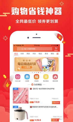 1、“省钱”淘宝天猫优惠券免费领,每日更新大额优惠券,领券购物好省钱,一键免费领取,简单方便直接抵现金。2、“特卖”9块9包邮,收集低价好货,领券购物,下单包邮,日用、美妆、零食、穿搭这里只要几块钱。