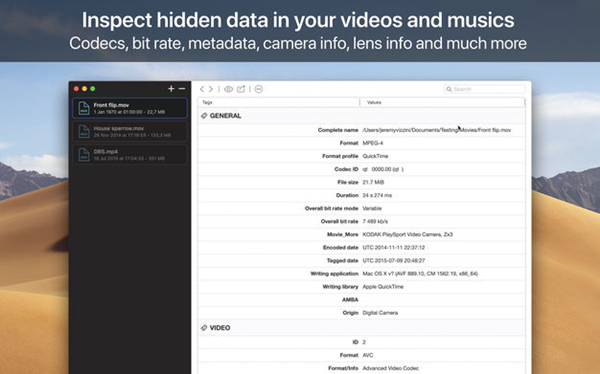 支持的信息:- 视频容器:格式,配置文件,格式的商业名称,持续时间,总体比特率,书写应用程序和库,标题,作者,导演,专辑,曲目编号,日期,持续时间...