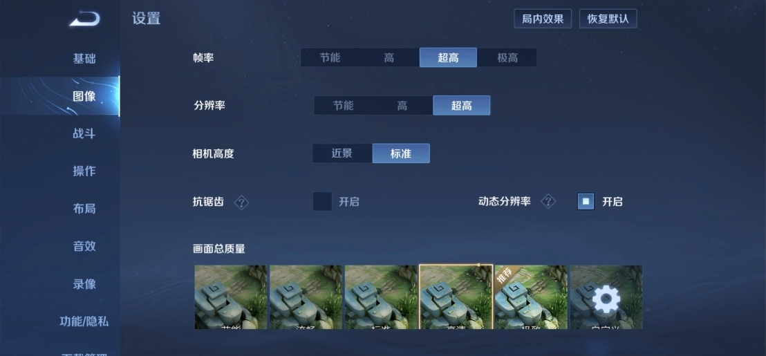 1、打开王者荣耀主页,点击右上角的齿轮图标进入设置界面,选择“图像”选项,适度调低分辨率与帧率数值,同时开启“动态分辨率”功能。