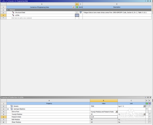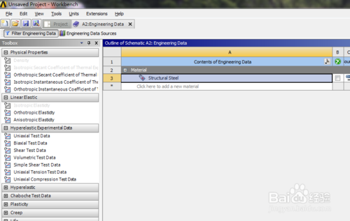 接着在工程A中双击工程数据,Engineering Data,进去后可看到系统默认的材料属性为结构钢。
