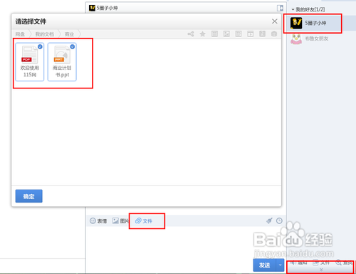 从网页右下角打开消息中心,选择好友,打开与好友的对话框,选择发送文件,弹出文件选择窗口,选择您要分享的文件(同一目录支持多个文件选择),点击确定。