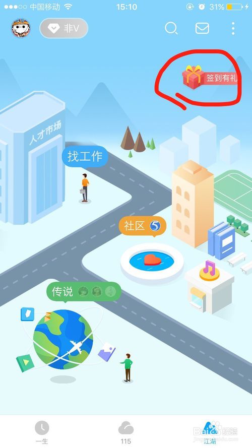2、接下来我们切换至第三个页面(亦即是“江湖”页面)。点击右上角的“签到有礼”图标。然后等待它切换至签到页面,点击签到。