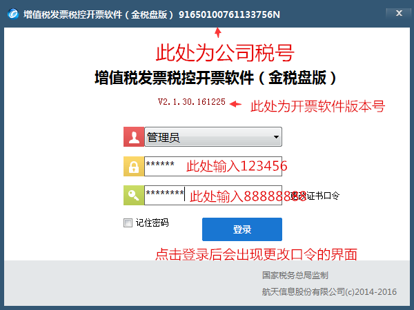 2、在开票软件登录界面,(默认选择管理员,初次安装的“第二行密码”栏中输入“123456”,在“第三行证书口令”中输入初始口令“88888888”,(重新安装开票软件的,证书口令输入12345678)点击“登录”按钮。