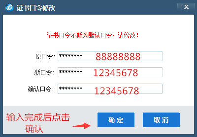 系统弹出修改证书口令,最好设置新的证书口令为“12345678”