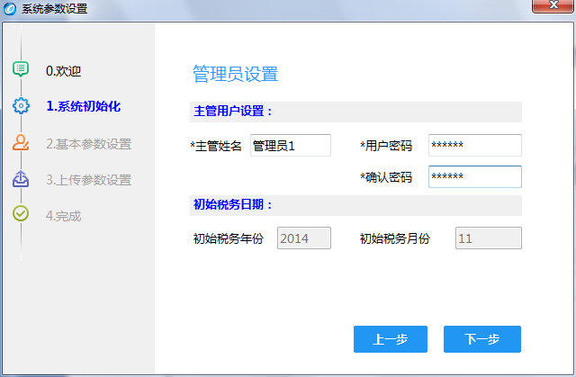 4、完成系统初始化后,点击“下一步”按钮,进入基本参数设置界面。在此填写营业地址、电话号码和开户行及银行账号。完全点击“下一步”,完成即可