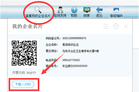 重点一:获取自己的二维码或6位开票代码方法一:如果您使用了开票软件,进入开票软件中点击【查看我的企业名片】,就可以查看到二维码和6位开票代码