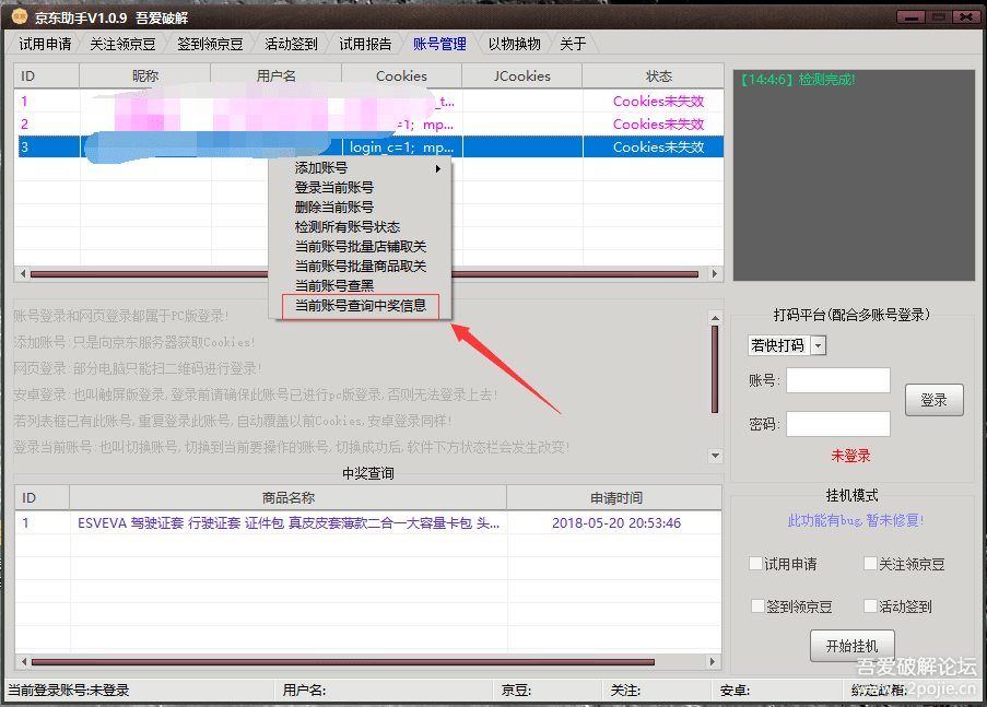 3.试用商品申请支持批量取关店铺,这个功能很实用(账号管理右击即可批量取关);