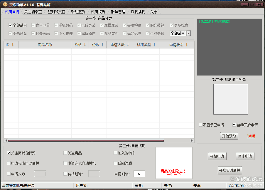 1.京东助手,集京东试用商品批量多账号申请、试用报告下载、京豆领取、京东砍价以及优惠卷抢购于一体,实现京东多功能辅助工具;2.试用商品申请,支持分类搜索,价格筛选,商品关键词筛选,关注店铺,中奖查询,多账号同时申请;