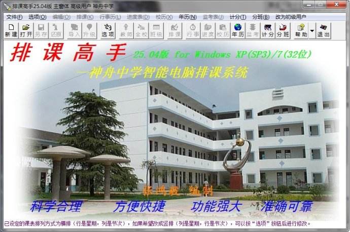 功能强大:五种排课方式可以满足任何排课要求。可以排早晚自习课表,可以合班上课、间周上课,教师指定节次不排课。班级课表和任课教师课表同屏显示,方便调课。