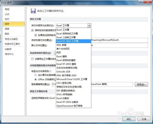4、设置“将文件保存为此格式”,如保存为Excel97-2003工作簿格式请选择“Excel97-2003工作簿”。默认保存格式为“xlsx”格式。