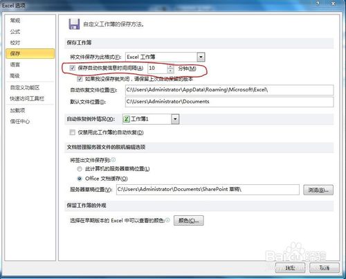 5、设置“保存自动恢复信息时间间隔”前的复选框打对号,并设定时间,默认为10分钟。