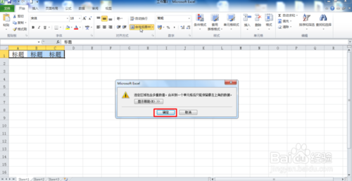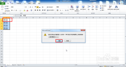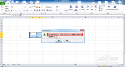 11、合并单元格时,只能保留第一个小单元格的数据,在弹出的对话框中,点击确定按钮,如图所示: