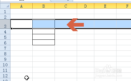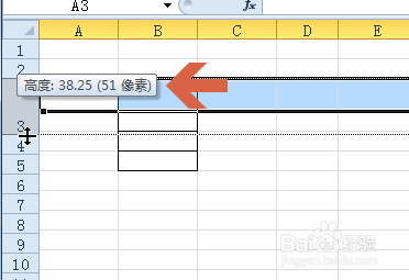 6、如果想快速设置行高,对行高值要求不太精确。可以将鼠标指针指向行号的交界处,当鼠标指针变成图中所示形状后,按住鼠标左键不放,同时上下拖动鼠标。