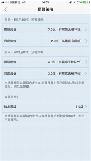 成都高新减灾研究所给出的触发策略建议是:白天为 4 级 2 度,夜晚为 5 级 3 度,大震提醒的触发震级可选择 6 级。“地震预警”app 具有自动定位功能,地震时,该应用会自动计算地震对手机所处区域的预估烈度和预计地震横波到达时间。