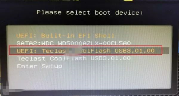4.在键盘上按上下方向键"↑↓"选择到U盘启动(选项有显示USB或你U盘品牌英文名称),我这里选择"UEFI:Teclast CoolFlash USB3.0",按“Enter”键后电脑进入PE。