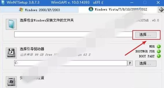 1)若图中绿灯处显示为“MBR”:点击【选择】,选择【C】盘,再点击【选择文件夹】。