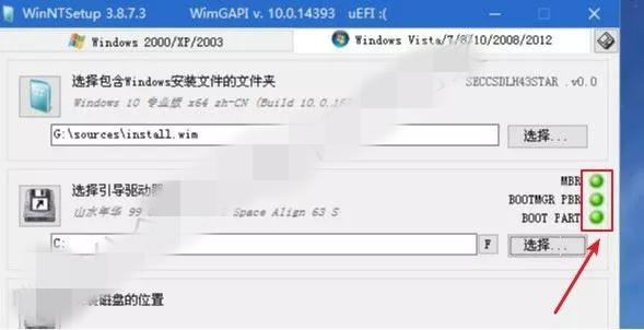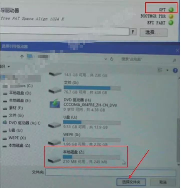 2)若图中绿灯处显示为“GPT”:点击【选择】,选择“一个300MB左右的盘,一般情况下为最后一个盘”,我这里为【Z】盘,点击【选择文件夹】。
