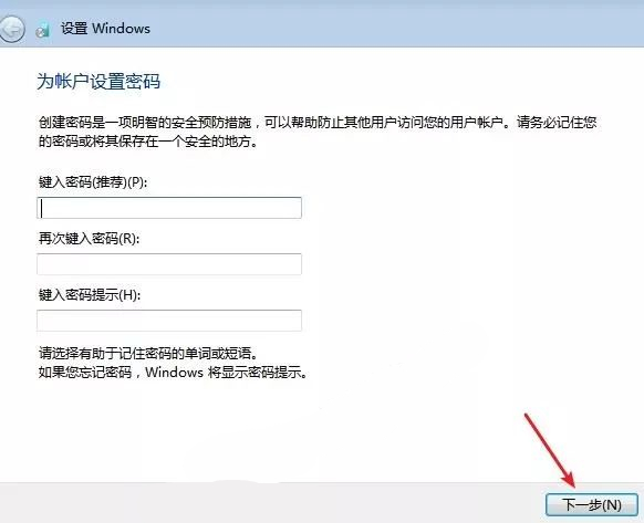 17.设置密码(电脑开机时需要此密码),直接点击“下一步”可设置开机无需密码。