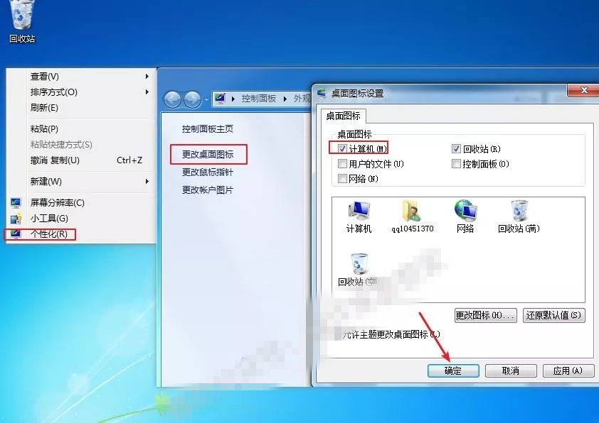 1)在桌面空白处鼠标右击选择“个性化”,点击“更改桌面图标”,勾选“计算机”点击“确定”。