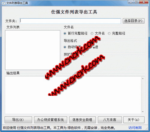 仕强文件列表导出工具 V1.0 绿色免费版 仕强文件列表导出工具(以下简称本工具)可以快速导出文件列表,进行过滤导出结果,格式化导出内容。本工具是绿色免费软件,您可以根据需要自由使用和传播本软件。请尊重原作者版权,不对本工具进行逆向处理。使用本工具之部分时,请与作者联系,并在显着位置显示仕强科技标志。本工具是基于微软.net framework 2.0 sp1 基础开发,在未安装本平台的机器上需要手动安装相关环境。本工具提供手动升级功能,执行 updater.exe 可以对本工具进行升级。本程序可能不定期进行维护。